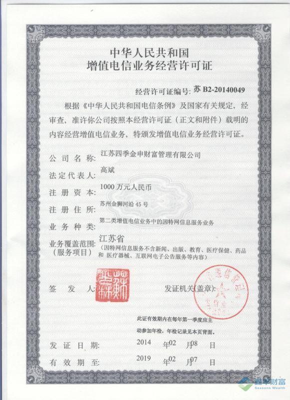 2014年2月8日,根据《中华人民共和国电信条例》及国家有关规定,经江苏省通信管理局审查,鑫申财富成功取得了由江苏省通信管理局颁发的中华人民共和国增值电信业务经...