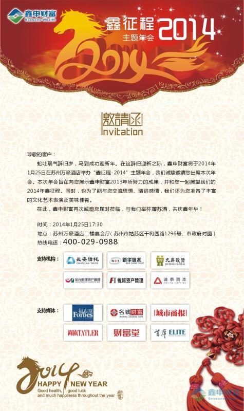 尊敬的鑫申新老客户:蛇吐瑞气辞旧岁,马到成功迎新年。在这辞旧迎新之际,鑫申财富将于2014年1月25日在苏州万豪酒店(苏州市姑苏区干将西路1296号,地铁1号线...