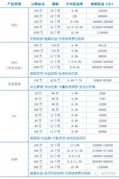 信托产品的超高收益:截至2014年7月17日,信托行业公布实际年化收益率的项目总共460个,平均年化收益率为8.7%。同时,由于严格的风控体系和优质政信资源,信托产品安全性高于基金,风险较低。