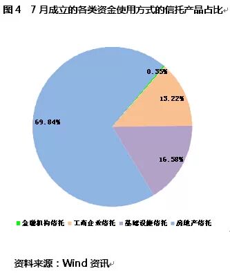在可以统计资金运用方式的97只信托产品中,有50只是房地产信托,规模达85.54亿元,占整体的69.84%。7月成立的房地产信托数量比6月增加11只,规模增加16.68亿元。
