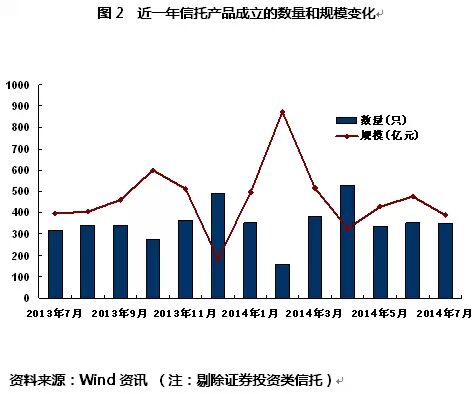 从近三个月来看,信托产品的发行数量一直变化不大,规模则在6月小幅增加后7月的减少较多。7月初,央行发布的178号文进一步加强对同业业务的监管,“T+D”、买入转售等规避监管的模式被叫停,对信托销售有一定影响。