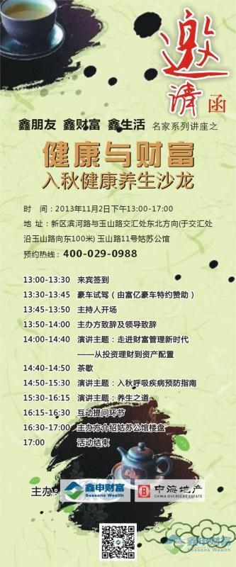 为了回馈广大新老客户长期以来对我们的支持,鑫申财富值此金秋季节特举办一场主题为健康与财富——入秋保健养生的沙龙,欢迎有兴趣了解入秋保健知识的朋友踊跃报名参加。鑫申财富客户莅临现场更可享受购房2万抵60万、豪车试驾等增值体验。