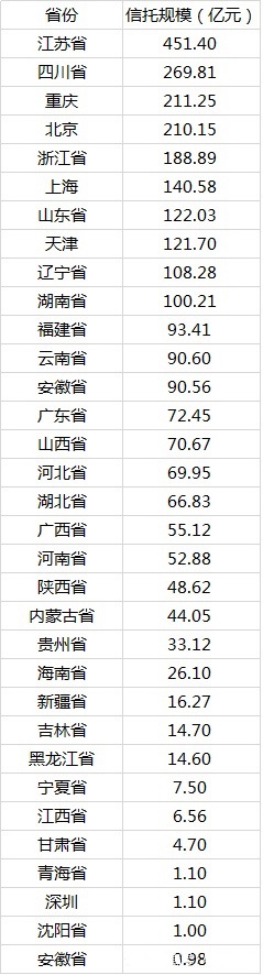 数据显示,江苏省以451.40亿元的规模居于首位,除了江苏省之外,还有9个省份的信托规模超过了100亿,依次是四川、重庆、北京、浙江、上海、山东、天津、辽宁、湖南。因2013年部分一年期产品已经兑付,以及2014年发行数量只到第三季度,所以最新省份信托数据分布较年初有较大差距。