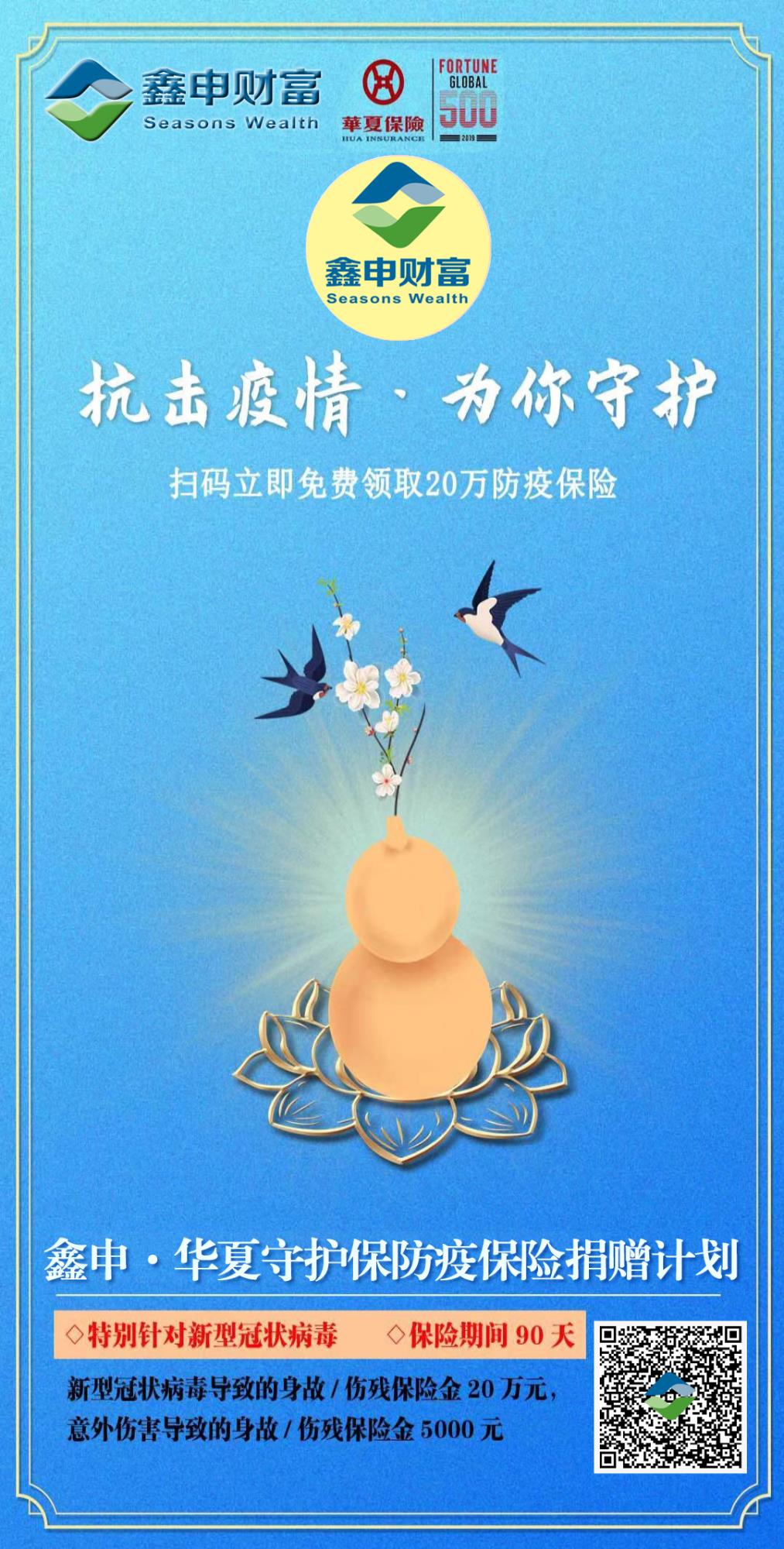 新冠肺炎疫情蔓延,鑫申财富集团作为财富管理行业的领军企业及苏州市财富管理业商会会长单位,密切关注疫情进展,根据抗击疫情的实际需要,在抗疫阻击战进入攻坚克难的关键时刻,为了替国家、社会分忧解难,集团联合世界500强企业华夏保险,向客户及合作伙伴免费赠送保额高达20万元的防疫保险,以实际行动践行企业担当与企业社会责任,为抗“疫”一线贡献绵薄之力。