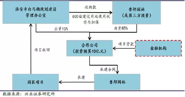 公司是园林行业内首个推出PPP模式的公司。公司在2014 年5 月中标的淮安白马湖森林公园项目中首先引入PPP 模式,项目投资概算约10 亿元,占公司2013年年度营业收入的41.8%。该项目中,淮安市白马湖规划建设管理办公室出资整体投资的15%,普邦园林成立的合作公司将出资85%。项目结束后股权将直接被回购,投资建成的公园最终将归白马湖规划建设管理办公室所有,白马湖规划建设管理办公室向普邦园林支付收购款,白马湖森林公园景区的收入将作为支付收购款的来源之一。