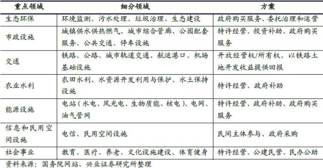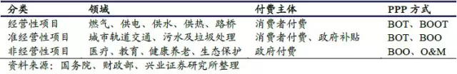 国务院近期发布的《关于创新重点领域投融资机制鼓励社会投资的指导意见》中重点提到了生态环保、农业水利、市政设施、交通、能源设施、信息和民用空间设施、社会事业等七个重点领域。财政部发布的30 个政府和社会资本合作模式(PPP)示范项目则重点推介了供水、供暖、污水处理、垃圾处理、环境综合整治、交通、新能源汽车、地下综合管廊、教育、医疗、体育等多个领域。从项目所在的行业来看,主要集中在污水处理、轨道交通、供水、供暖等以“使用者付费”为特征的经营性项目。这类项目收益相对较高且较为稳定,有利于吸引社会资本参与。