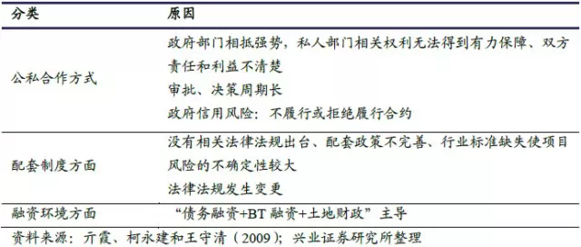 总结来看,我国PPP 模式没有得到迅速发展的主要原因表现在公私合作方式不明确、配套制度的缺失(政策、法律法规、行业标准、示范案例等)以及政府融资模式的变化等方面。