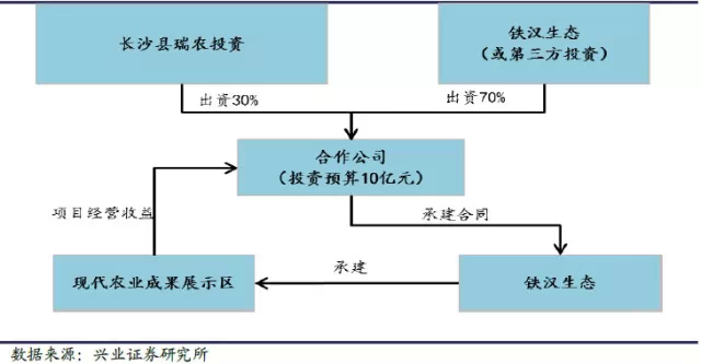 2014 年12 月,公司拟与长沙县瑞农现代农业投资开发有限公司合作开发“湖南(长沙)现代农业成果展示区”项目,是公司PPP 模式的首次尝试。该项目规划总面积2797 亩,总投资10 亿元,其中一期5 亿元。项目拟采用公私合作PPP模式,由合作双共同出资设立项目公司,其中长沙瑞农投资持有项目公司股份不低于30%,铁汉生态(或与第三方投资机构)持有项目公司的股份不高于70%。项目合作期限不超过30 年。