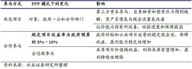 项目需求增加,业务领域将有所扩大:PPP 模式作为新的融资手段在加大推广后有望在较大程度上缓解地方债务对基建投资需求的约束,项目需求将增加;同时PPP 模式通过特许经营权的授予,其所应用的业务领域,可从传统的基建、城市公共事业及公共交通领域逐步扩展到电力、医院医疗、文化、旅游等基础设施领域,企业的业务发展有望大幅扩大。