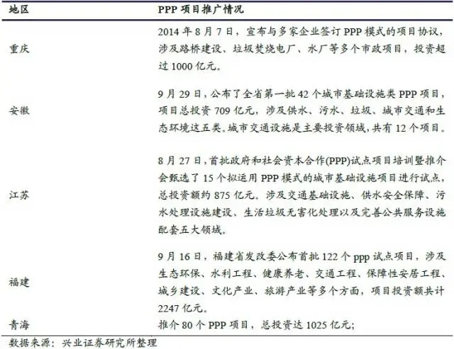 今年8 月份以来,重庆、江苏、安徽、福建、青海等地先后发布了首批PPP 试点项目计划,各省计划投资额都在千亿左右级别。据不完全统计,国家层面和地方政府今年以来推出的PPP 项目已达近8000 亿元。目前首批PPP 项目开始进入项目准备及采购等实施阶段,随着明年地方政府基建项目计划的制定,PPP 项目将大量涌现。