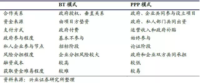 与现阶段的BT 模式相比,PPP 模式在合作关系、民营企业进入时间、支付方式、政府参与程度、风险分担、融资渠道和成本等多方面存在差别。