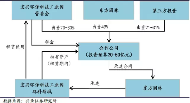 此次项目将采用PPP 模式之中的BLT 模式(建设-租赁-移交),即东方园林及东方园林引入的第三方公司与中国宜兴环保科技工业园管委会下属国有投资公司共同出资成立合资公司(东方园林相对控股);合资公司按单项工程分批建设、分批租赁给甲方使用,租赁期内资产由合资公司持有,宜兴环保科技工业园管委会负责进行管理、运营并支付租赁费。租赁期满,项目将移交给工业园管委会。BLT模式(建设-租赁-移交)下,引入政府和第三方投资,将有效改善公司现金流状况;同时分批建设、分批租赁下项目稳定的运营收费,也将进一步保障公司资金回收安全。