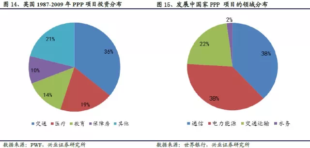 发达国家:PPP 从基建领域向公共服务领域延伸。在PPP 市场较为成熟的欧盟国家, PPP 适用领域涉及一般公共服务、公共秩序、交通运输、燃料和能源、环境、卫生、娱乐和文化、教育等。作为全球PPP 项目规模最大、涉及领域最广的国家,英国PPP 模式的推广路径呈现出从基建领域向公共服务领域延伸的特点。从上世纪90 年代开始,英国在具有收益性质的基础设施建设等领域应用PPP 模式,包括公路、铁路、机场、港口等,此后逐步推广到包括卫生(医院)、公共安全(监狱)、教育(学校)等公共服务领域。1987 年-2009 年,英国一共批准PPP 项目730 个,运营金额达540 亿英镑,主要集中在交通、医疗和教育领域,从项目投资分布上看,交通占36%、医疗占19%、教育占14%、保障房占10%。发展中国家:PPP 仍集中在基建领域。从发展中国家PPP 项目的应用领域来看,仍主要集中在基础设施领域,包括收费公路、轻轨系统、地铁、铁路、桥梁、隧道、机场设施、电厂、电信设施、学校建筑、污水处理和垃圾处理等方面。其中,电信、电力能源、交通运输及水务领域是投资金额分布主要的领域。
