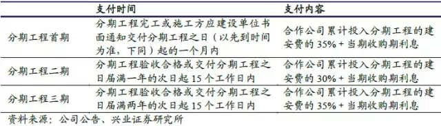 普邦园林作为施工方,按施工进度获得建安工程进度款。工程分期验收,每一期交付后,业主分三期向合作公司支付工程收购款,包括“合作公司支付的建安费用+投资回报+建设期利息+回购期利息”。