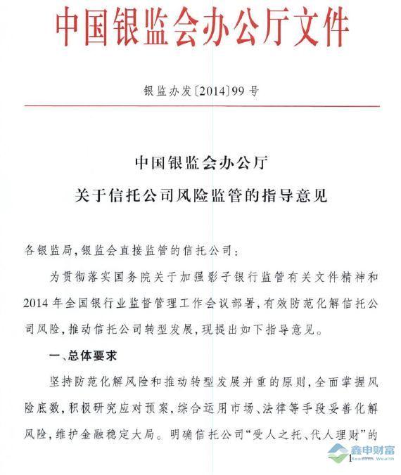 4月8日,银监会办公厅向“各银监局,银监会直接监管的信托公司”下发了《关于信托公司风险监管的指导意见》(银监办发[2014]99号,下称“99号文”)。一石激起千层浪,信托业内也对此广泛热议。