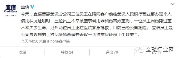 事件很快在微信朋友圈中传播开来。随后,宜信向腾讯财经做出事件回应,称死伤人员为宜信普惠武汉分公司员工,三位员工在陪同客户前往武汉人民银行营业部办理个人信用状况证明时,不幸被肇事者用器械伤害致重伤。