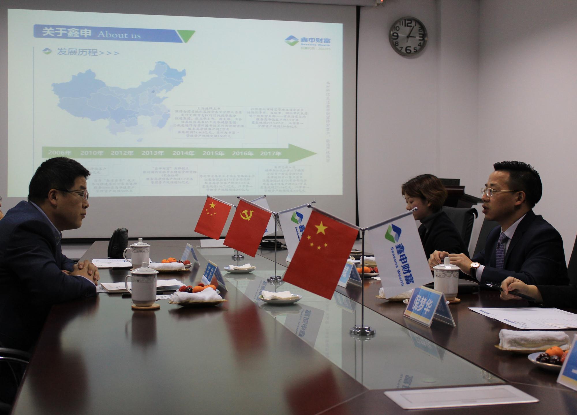 12月14日,长安财富资产管理有限公司(以下简称“长安资产”)常务副总经理王东先生冒着淅淅沥沥的冬雨莅临鑫申财富集团苏州市府营业部,就战略布局与业务合作方面与集团总裁高斌先生进行了深入探讨与交流。